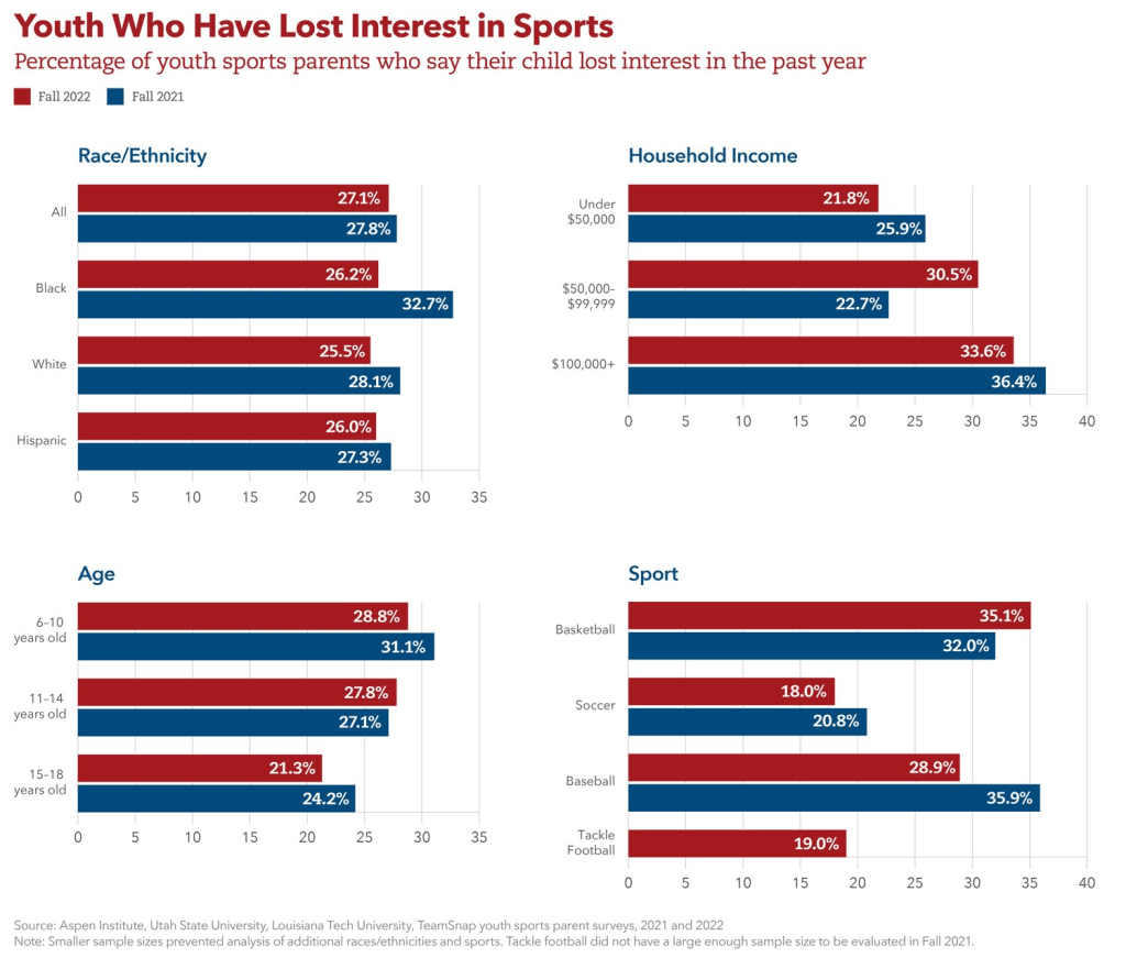 Indeed, the Aspen Institute found that, in 2022, youth participation in team sports remained at a “historically low” level. For some children, the absence of athletic commitments during COVID was something of a liberating experience, and they decided that they were better off without organized sports in their lives. The rate at which these children have lost interest in playing sports in the past two years is startling. This is reflected in the graphic below, courtesy of the Aspen Institute: